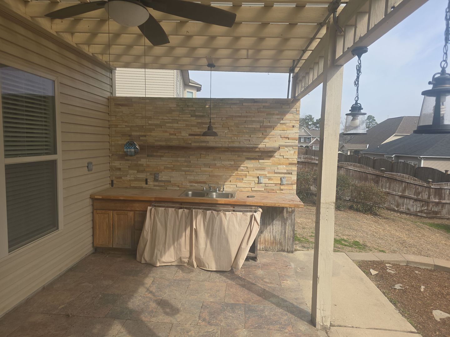 Eat in area with bar overlooks back yard.